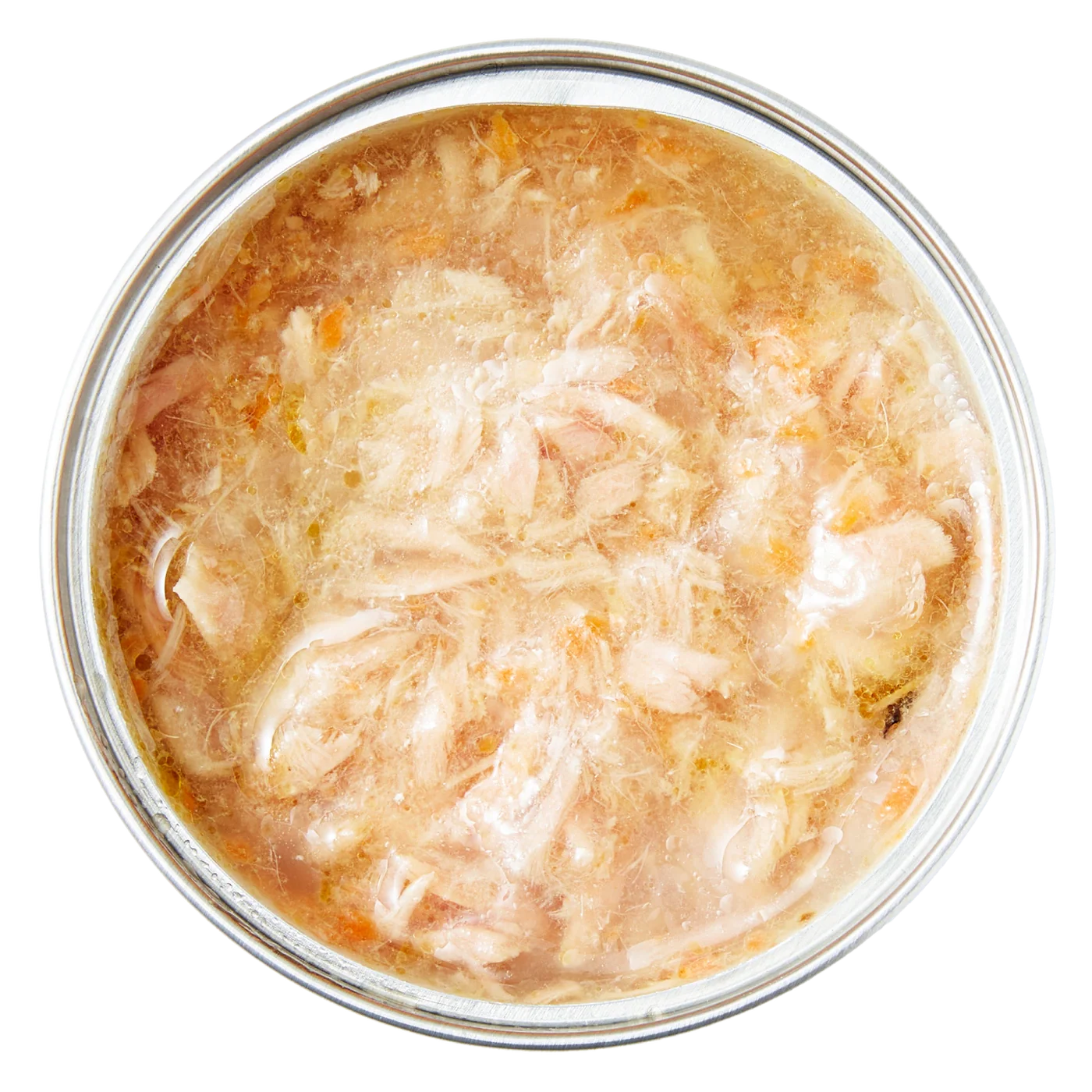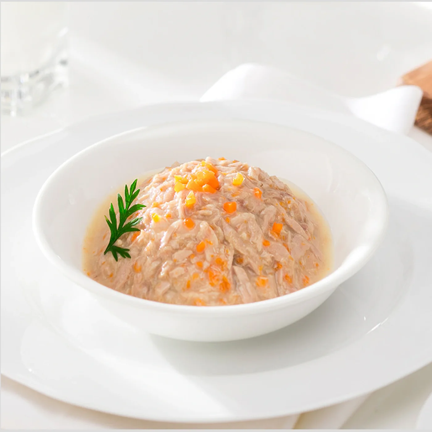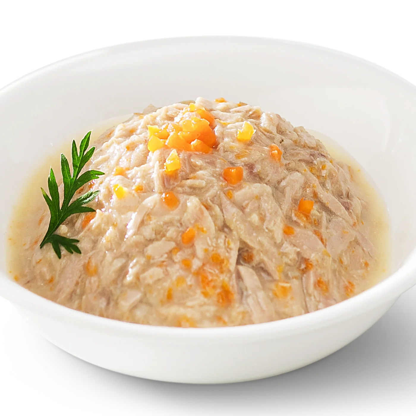 Вода, тунець 29,70%, морква 4,20%, соєва олія, крохмаль тапіока, трикальційфосфат, сульфат кальцію, хлорид калію.