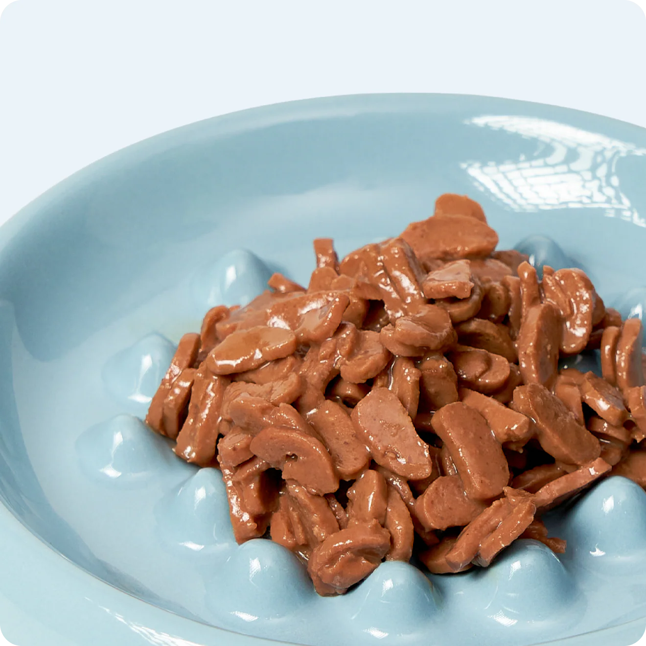 Курка 25,00%, тунець 10,00%, пшеничне борошно 8,00%, яловича печінка 3,00%, мінерали та вітаміни 2,00%, гідролізований курячий білок 1,00%, амінокислота (гліцин) 1,00%, моносахарид 0,30%, гуарова камедь 0,10%, екстракт юки 0,05%, пребіотики (інулін, FOS, MOS) 0,05%, таурин 0,03%, харчовий барвник [E172 (ii)] 0,01%, харчовий барвник [оксид заліза коричневий] 0,01%, вода 49,45%.