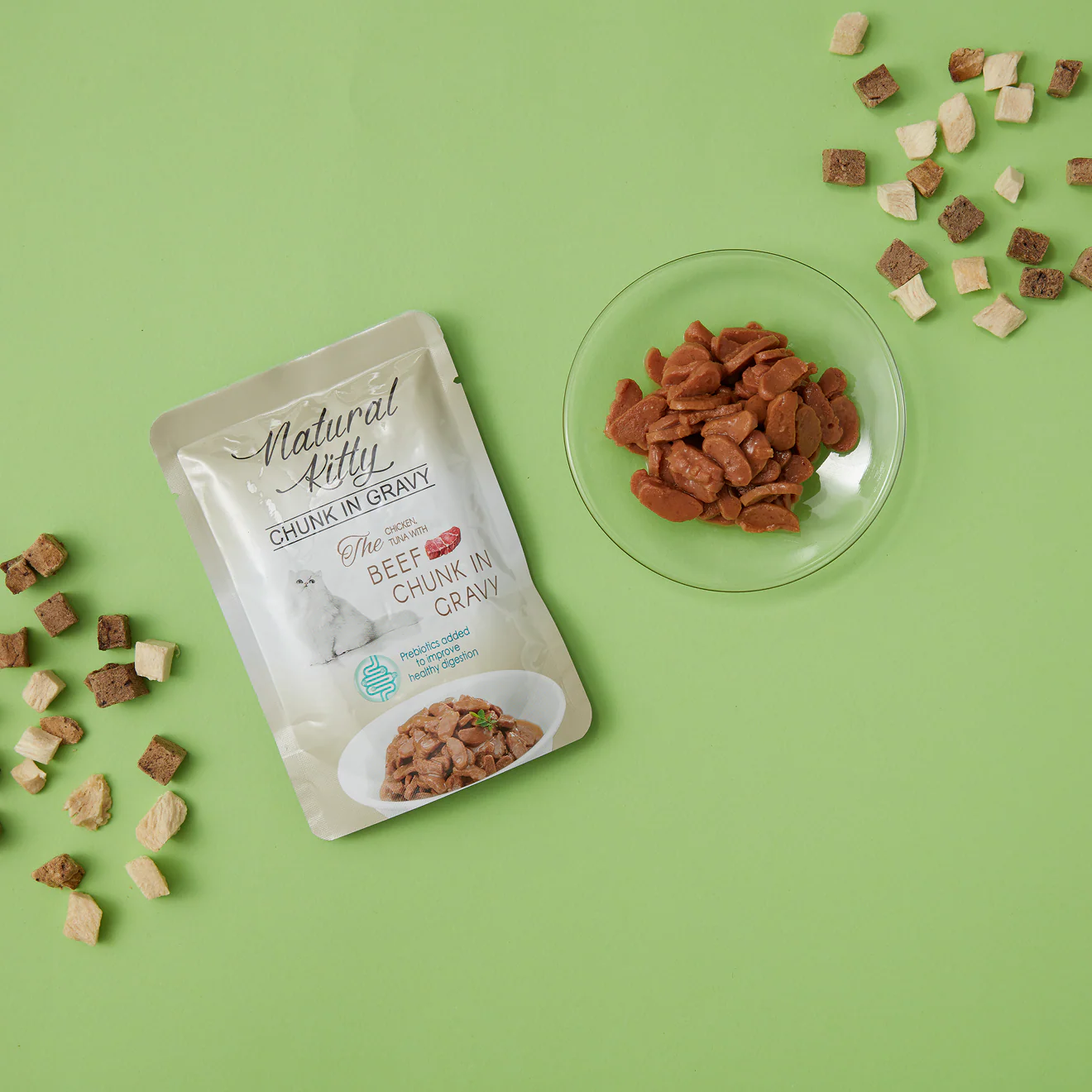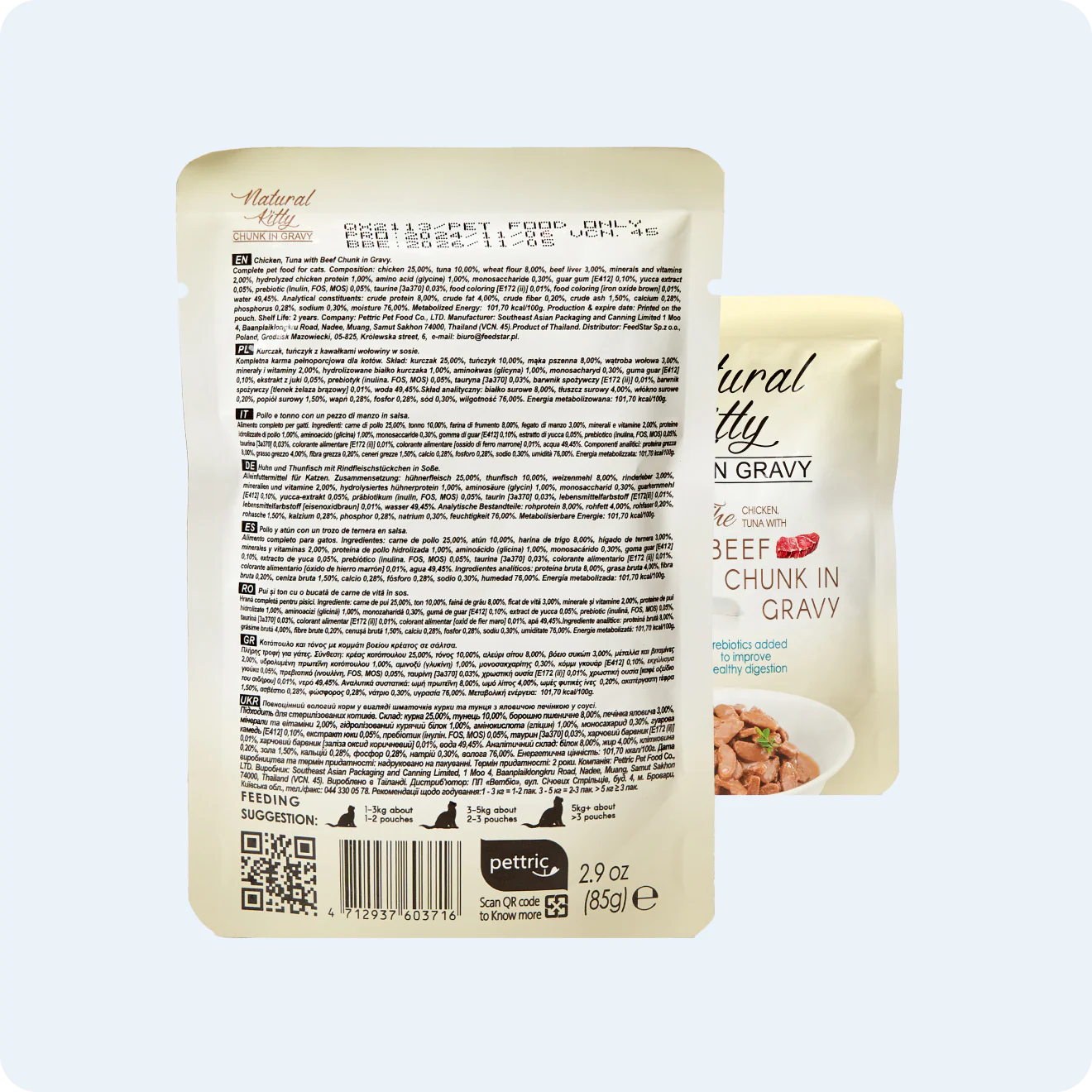 Вологий корм для котів Natural Kitty смачні шматочки курки, тунця та яловичини в соусі 85 г
