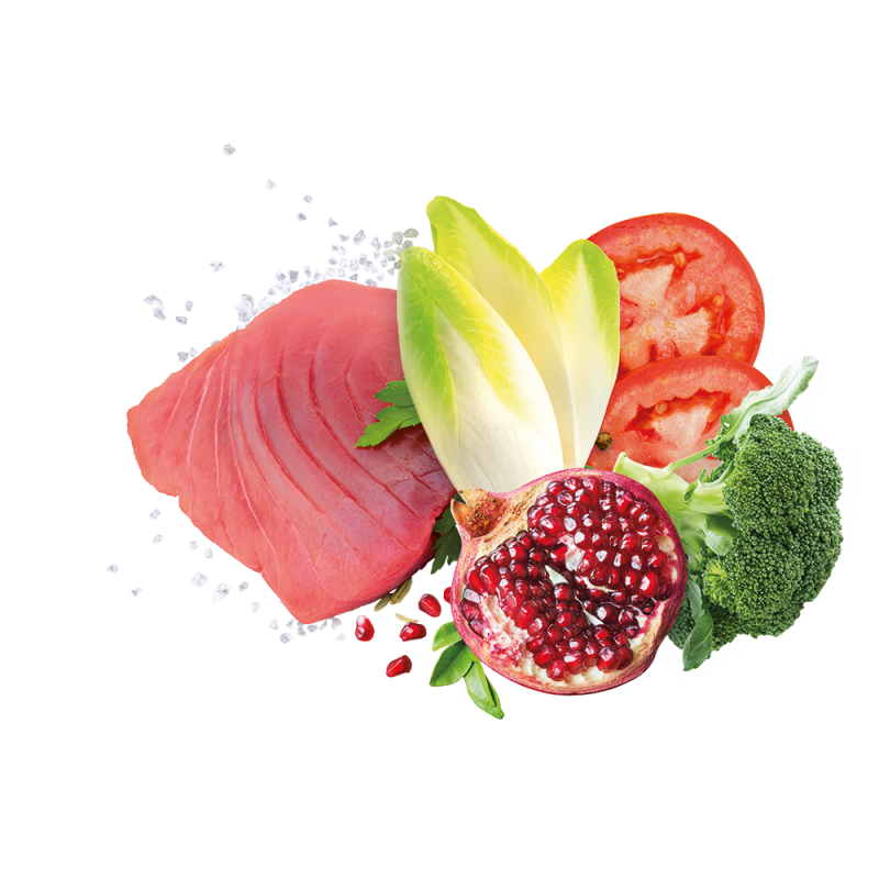 дегідрований тунець (27%), рис, горох, свинячий жир, риб'ячий жир, дегідрована люцерна, коноплі (1%), дріжджі, сушений цикорій (0,5%), мононатрію фосфат, олія рижію (0,3%), оливкова олія (0,3%), β-1,3 глюкани водоростей Euglena gracilis (0,06%), глюкозамін (0,04%), дегідрована броколі (0,03%), дегідрований гранат (0,03%), дегідрований томат (0,03%), юка моджаве, хондроїтину сульфат (0,01%)