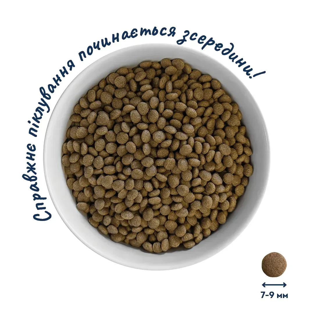 Склад: м’ясо індички 27% (дегідратоване м’ясо індички 19%, свіже м’ясо та обріз індички не менше 8%), зневоднений білок птиці 15%, рис цільнозерновий, зневоднений білок лосося 9%, індичий жир 4%, сорго, пластівці яблучні, зародок кукурудзяний, олія лосося 4% (джерело Омега-3, Омега-6), фітоформула АМРОЛ (амарант, розторопша, льон) 3%, яєчний порошок 3%, рослинні харчові волокна, гідролізована індича печінка 2%, олія «Сезам» (олії льону, кунжуту, коноплі, розторопші) 2%, цукати з гарбуза, бета-1.3/1.6-глюкани (пребіотик), мананоолігосахариди, насіння чіа 0.5%, інулін цикорію 0.4%, екстракт розмарину, квіти ромашки лікарської 0.04%, квіти календули 0.04% (джерело лютеїну), листя кропиви 0.04%, псиліум (оболонка насіння подорожника) 0.04%, юка Шидигера 0.04%.