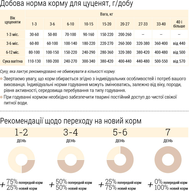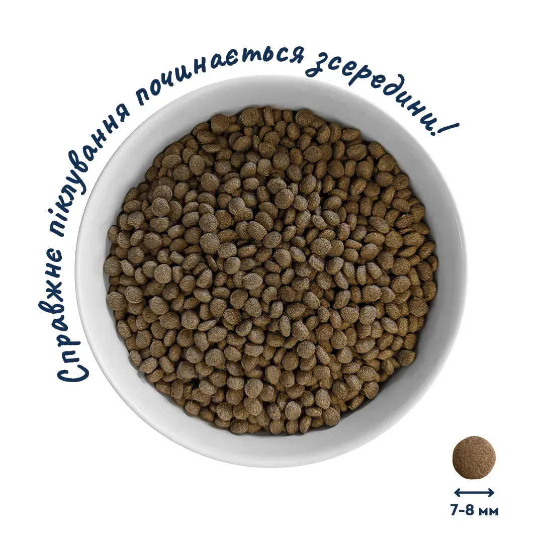 Поживні речовини: сирий білок 30%, сирий жир 16%, сира клітковина 2.2%, сира зола 5.9%, кальцій 1.5%, фосфор 0.9%, натрій 0.5%, вологість 10%, Омега-3 1.1%, Омега-6 3.14%.