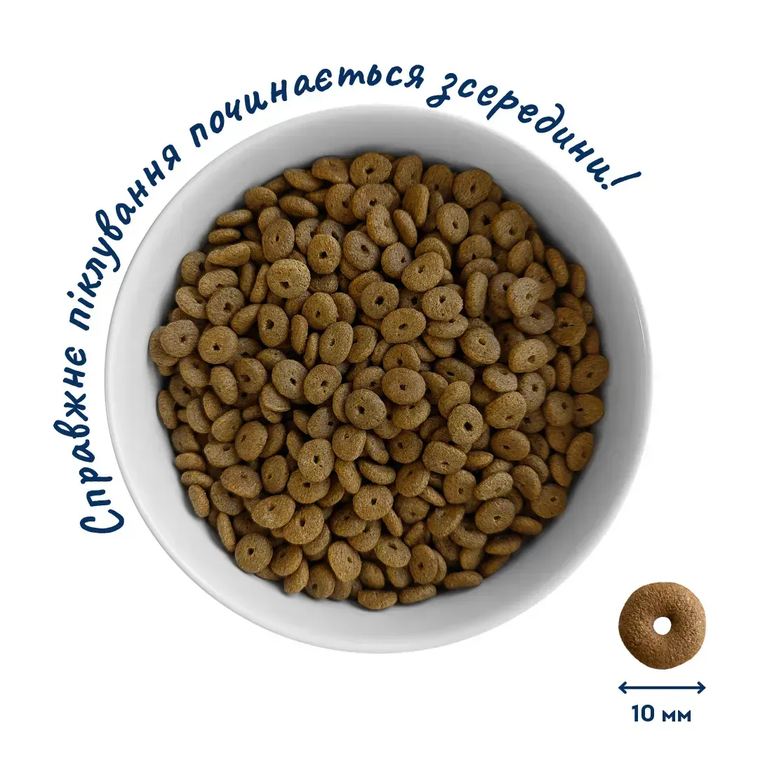 Склад: м'ясо куряче 30% (дегідратоване куряче м’ясо 18%, свіже куряче м'ясо не менше 12%), зневоднений білок птиці 14%, рис цільнозерновий, курячий жир 6%, свіжий лівер курки (печінка, серце, шлунок) 4%, цільна креветка 4% (джерело глюкозаміну), рослинна клітковина, висівки пшеничні, яблучна клітковина, олія лосося 3% (джерело Омега-3, Омега-6), дегідратований протеїн криля 3%, фітоформула АМРОЛ (амарант, розторопша, льон) 3%, гідролізована куряча печінка 2%, яєчний порошок 1%, бета-1.3/1.6-глюкани (пребіотик), інулін цикорію 0.4%, листя м’яти лимонної 0.1%, ромашка лікарська 0.04%, ехінацея 0.04%, листя кропиви 0.04%, листя малини 0.04%, псиліум (оболонка насіння подорожника) 0.04%.