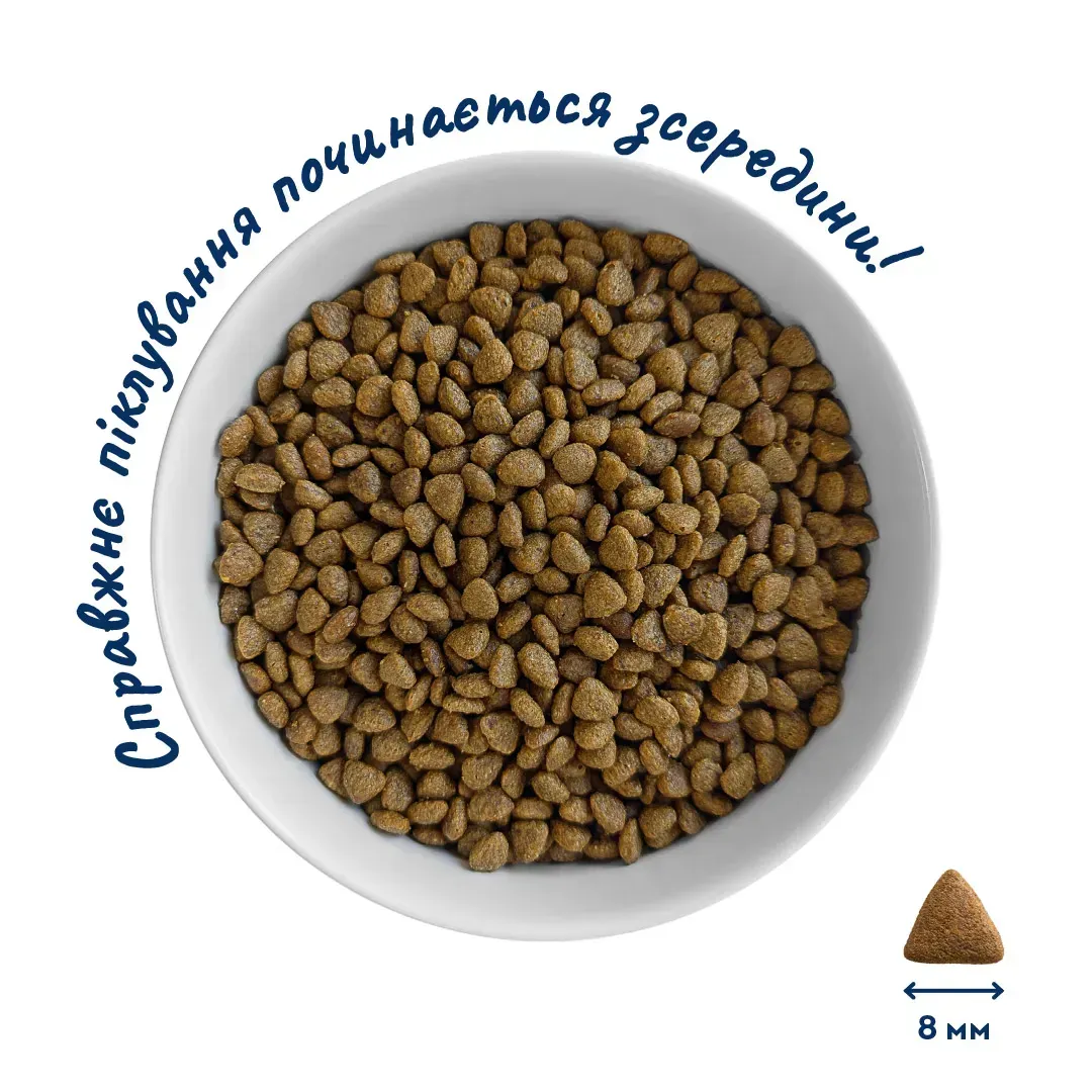 Склад: м'ясо індички 28% (дегідратоване м’ясо індички 18%, свіже м’ясо індички не менше 10%), зневоднений білок курки 15%, рис цільнозерновий, дегідратований протеїн лосося 10%, курячий жир 6%, рослинна харчова клітковина, олія лосося 4% (джерело Омега-3, Омега-6), яблуко сушене, червона сочевиця, дегідратовані пивні дріжджі, фітоформула АМРОЛ (амарант, розторопша, льон) 3%, яєчний порошок 2%, олія «Сезам» (олії льону, кунжуту, коноплі, розторопші) 2%, зародок кукурудзяний, гідролізована куряча печінка 2%, мананоолігосахариди (пребіотик), інулін цикорію 0.4%, листя м’яти лимонної 0.1%, ромашка лікарська 0.04%, ехінацея 0.04%, листя кропиви 0.04%, листя малини 0.04%, псиліум (оболонка насіння подорожника) 0.04%.