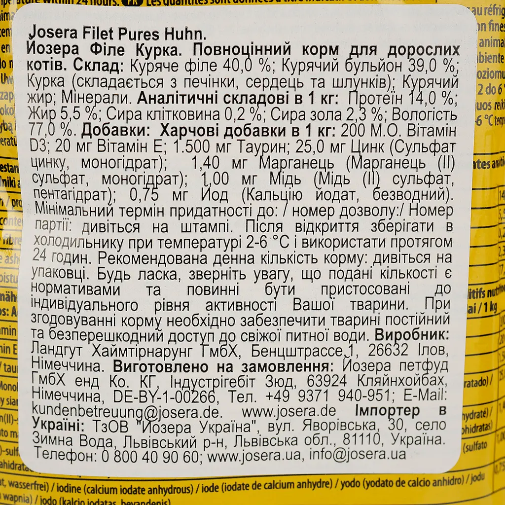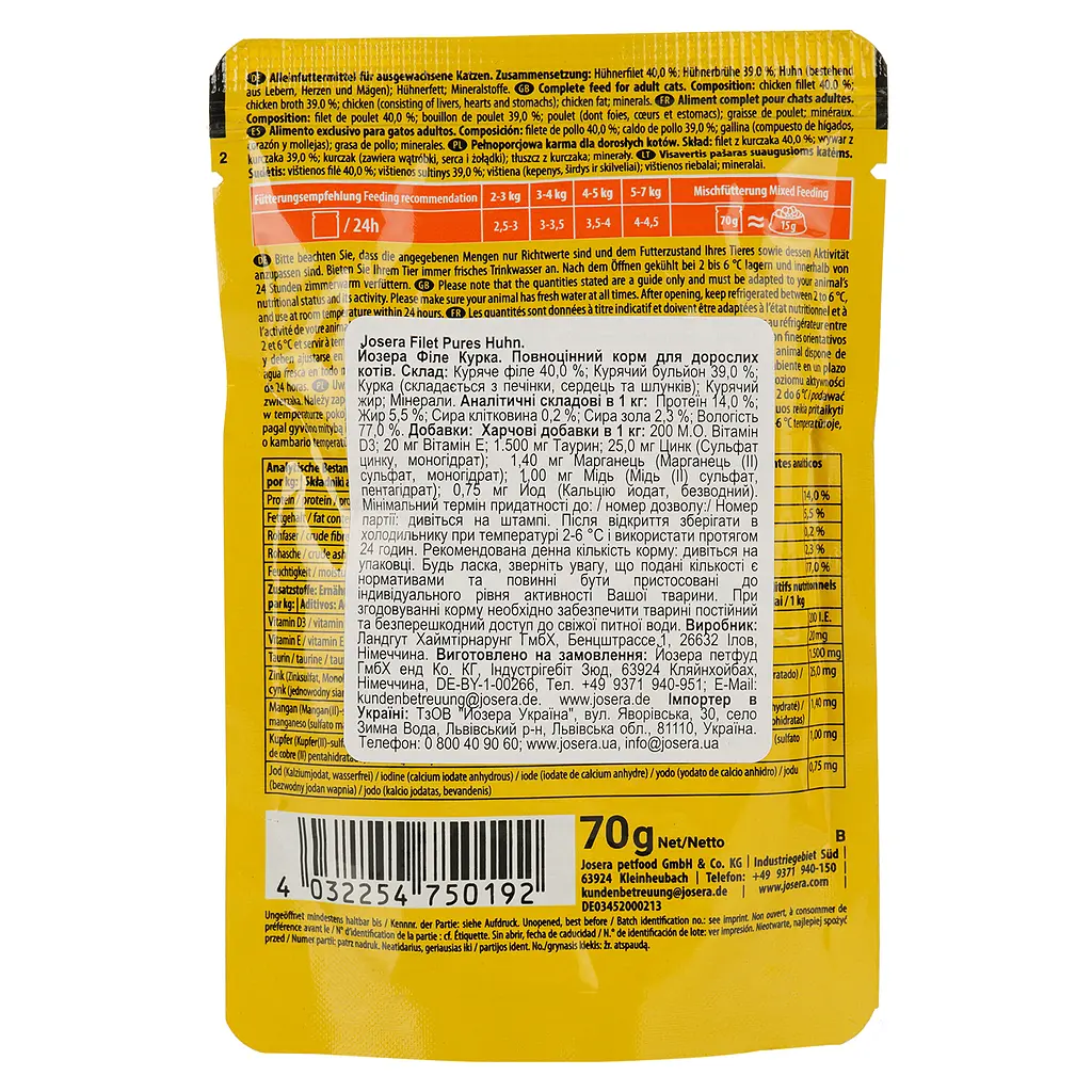 Вологий корм для котів з філе курки Josera Filet Pures Huhn 70 г